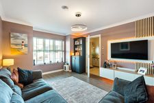 On the ground floor, the layout is ideal for modern family living. A bright entrance hall with attractive panelling and a contemporary tiled finish sets the tone, leading to a comfortable living room to the front featuring a striking media wall and bespoke-style joinery. To the rear, a spacious kitchen/dining room forms the heart of the home, with sleek cabinetry, timber worktops, and double doors opening directly onto the patio and garden. The ground floor also benefits from underfloor heating throughout, providing an efficient and comfortable living environment.