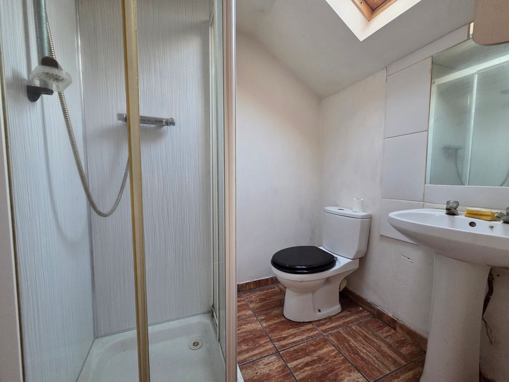 Tiled flooring, toilet, WHB, PVC shower enclosure and pump shower
