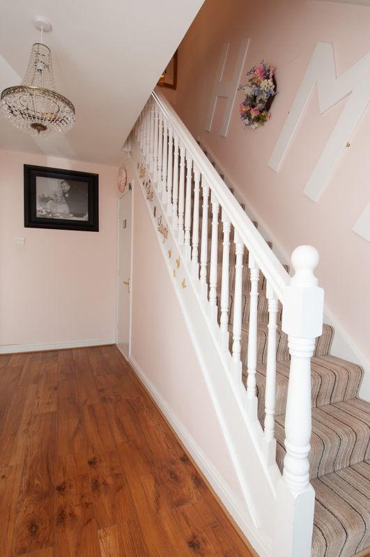 Upstairs, the master bedroom boasts built-in wardrobes, a bay window, and a fully appointed en-suite. Two further well-proportioned bedrooms are served by a modern fully tiled family bathroom.