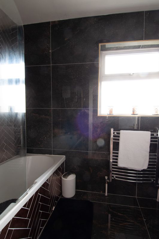 Fully tiled, bath with electric shower over, vanity sink, w.c