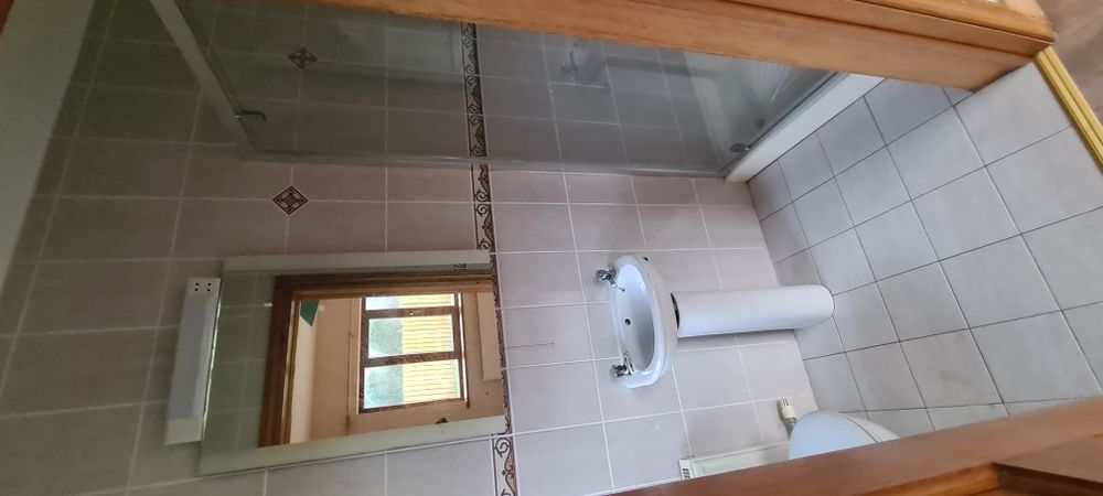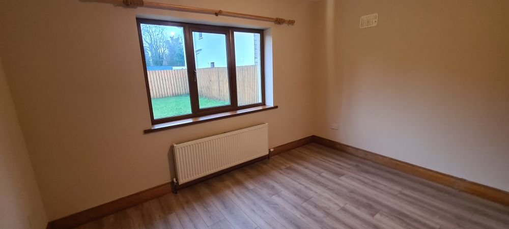 Double bedroom at the rear of the house with laminated flooring, power points, phone and tv point, window to rear garden, radiator. Ensuite which is fully tiled with wc, whb, electric shower, radiator, mirror and window.