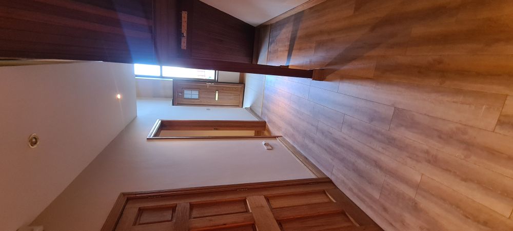 Entrance hallway with cream tiling and laminated flooring, wooden staircase leading up to first floor living and kitchen areas, power points, Airing cupboard with storage space.