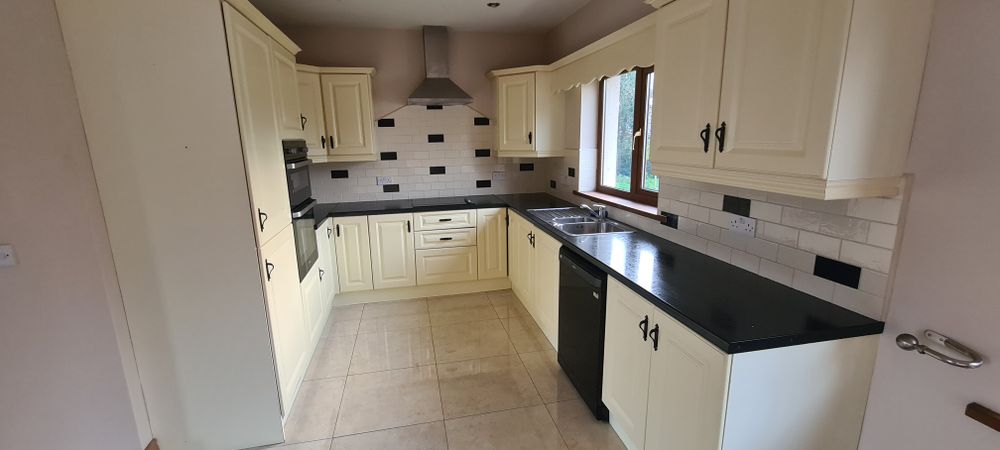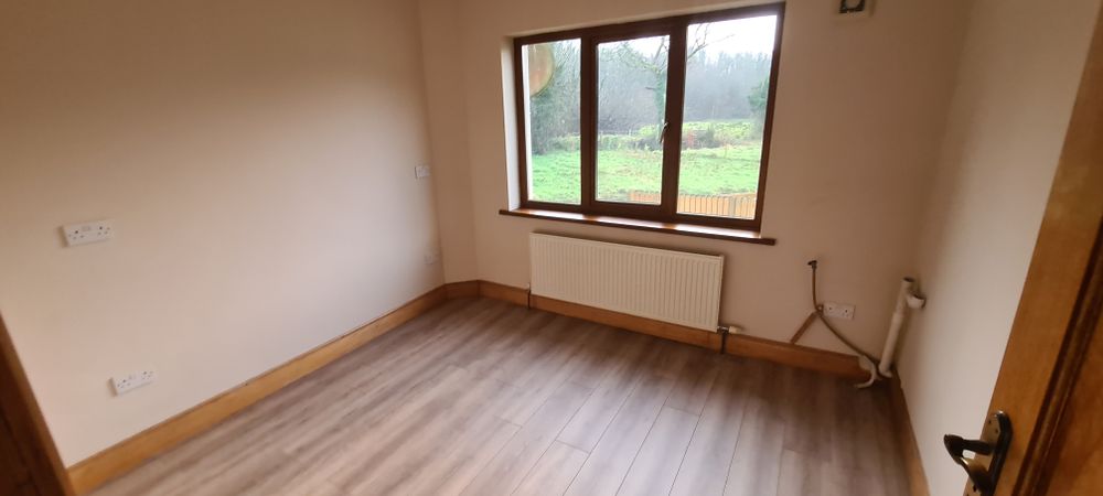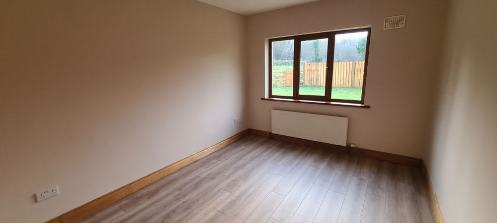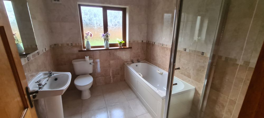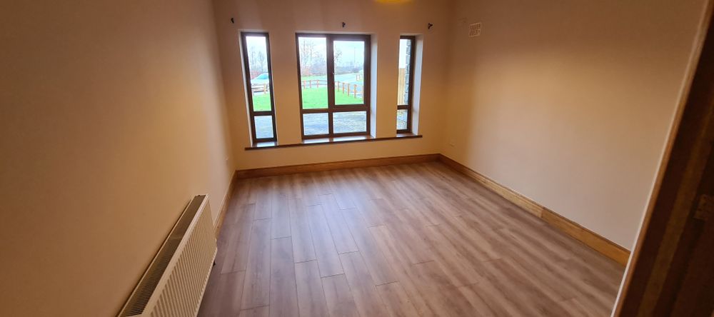 Large bright kitchen, dining and living area going from front to back of the house with doors leading onto the first floor balcony with views over Lough Allen. Ideal space inside and out for entertaining family and friends. Modern style kitchen with single sink, electric hob, double oven and built in mircrowave, plumbed for dishwasher, window to rear garden, lots of storage space, window to rear garden, power points, spotlights. Tiling throughout the kitchen area and laminated flooring on dining and living area, door back out to landing.