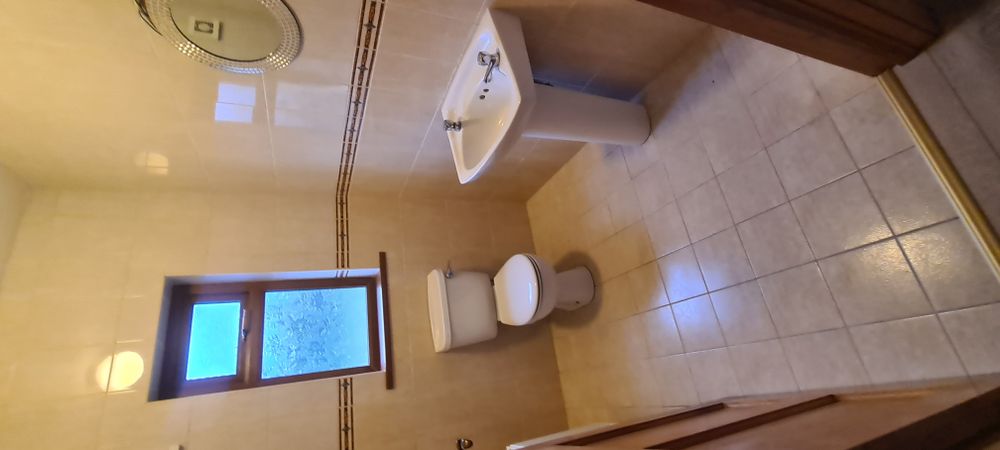 Bathroom with toilet and whb, fully tiled, radiator and mirror.