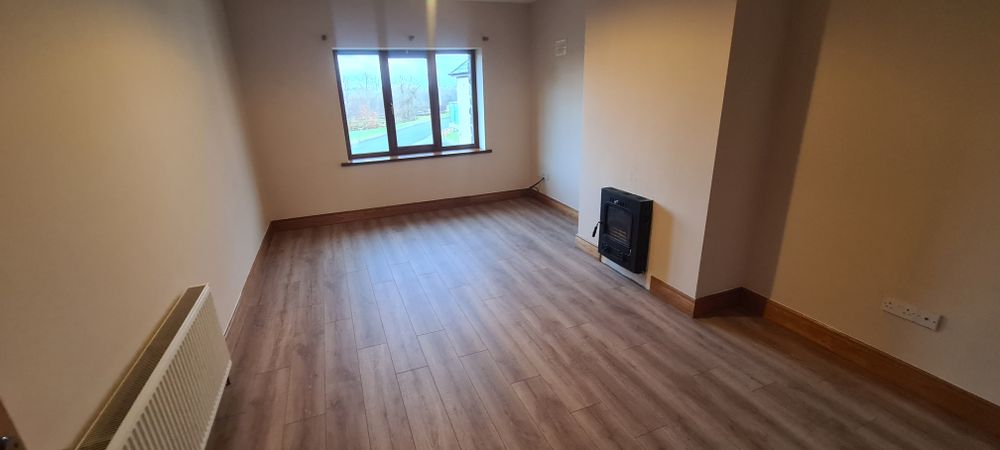 Living room on the first floor which is spacious and bright with laminated flooring, inset stove, power points, tv point, view over to Lough Allen, spolights,radiator.