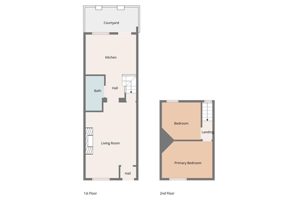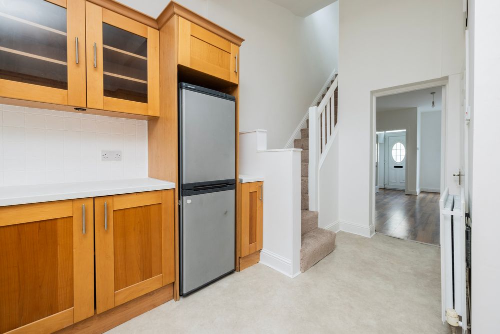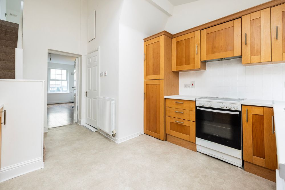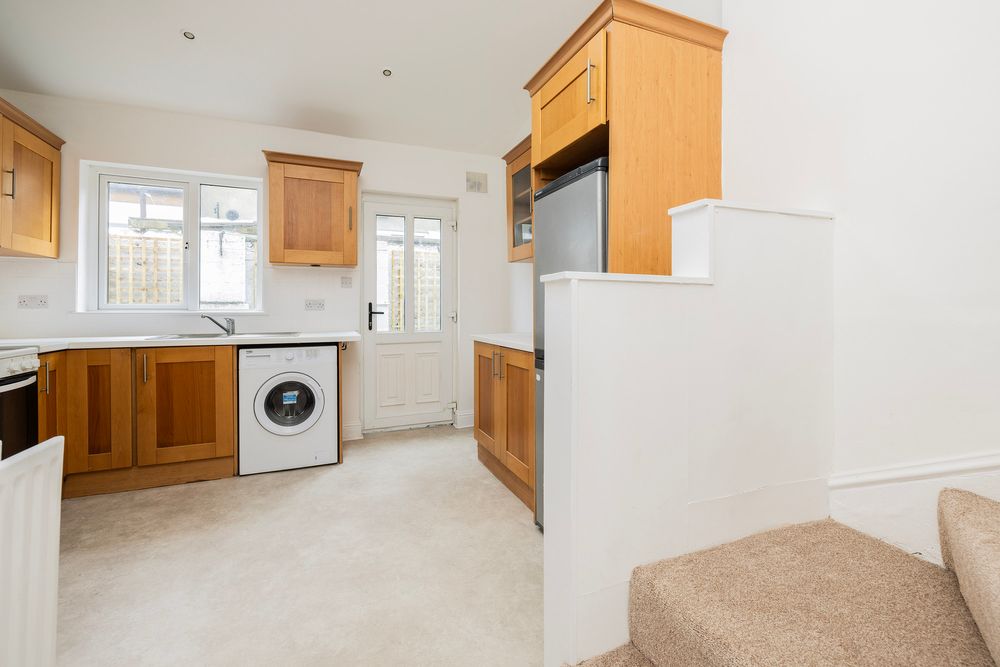 Wonderful bright spacious kitchen, with 3.4m high ceilings, good source of natural light through Velux window paired with a large window overlooking the courtyard garden.. The kitchen features a good range of Shaker style wall and floor units with integrated extractor fan, stainless steel sink and drainer with splashback tiled in classic white tiles. Door leading to south facing rear courtyard. An angled staircase off the kitchen area leads to the upper level.