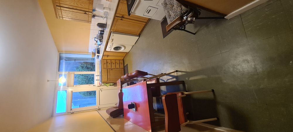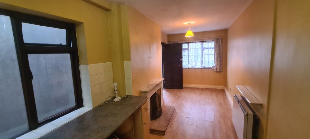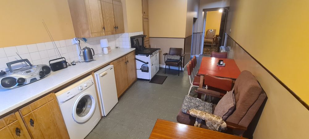 Kitchen at the rear of the house with door to external back yard, oil fired range which heats water and radiator in living room, sittingroom and hall and bathroom, there is also an electric storage heater, tiled flooring, storage units and single drainer sink, plumbed for washing machine, door to storage press, heater.