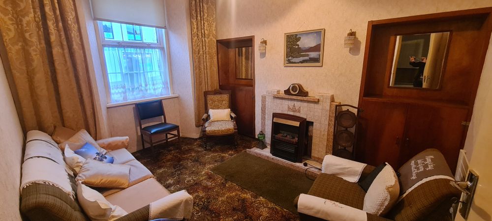 Sittingroom to the front of the property with carpeted flooring, large window out onto Bridge Street, open fireplace with tiled surround, built in storage space, radiator, power and tv points, high ceiling.