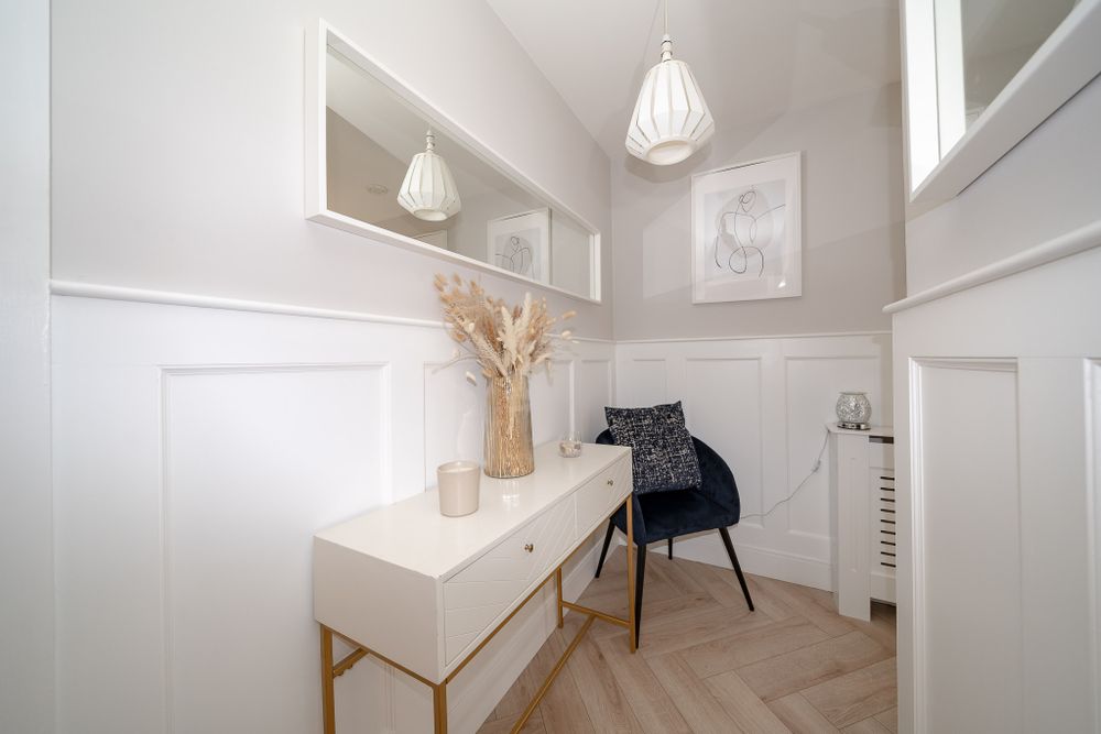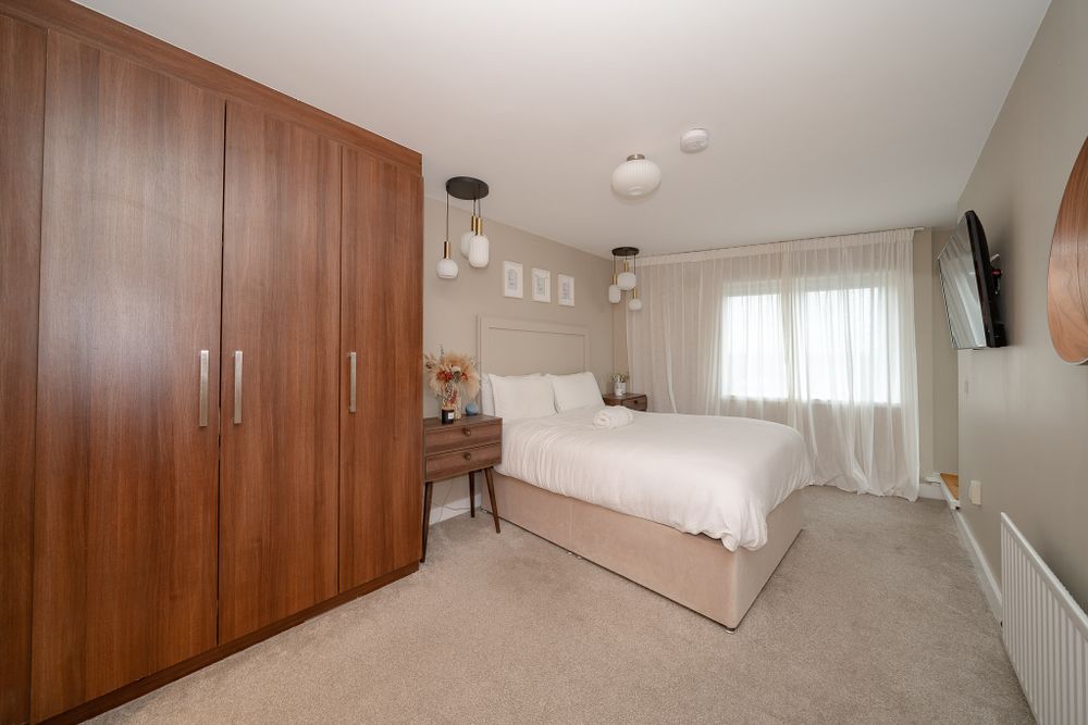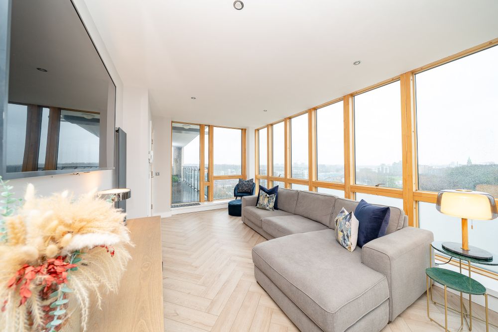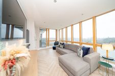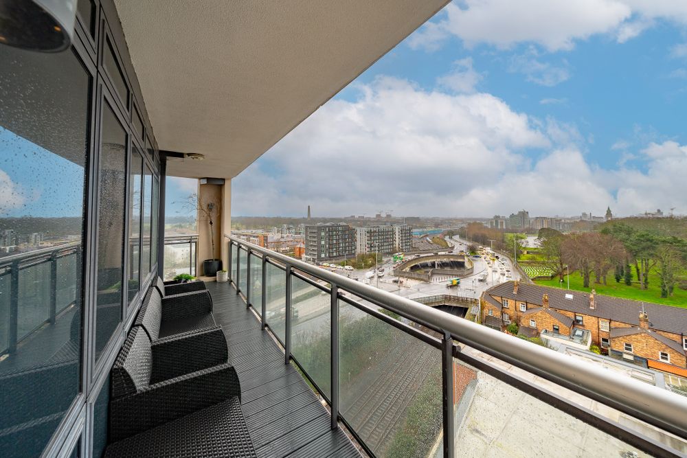 This stunning property features an entrance hall with herrningbone floors, wood panelled walls and a utility room. The herringbone floors continue to the light filled open plan living room, dining area and kitchen which also boasts new vertical radiators and spotlights. Floor to ceiling windows give spectacular views of The Phoenix Park, Bullys Acre, Kilmainham Gaol and The Dublin Mountains. The fully integrated U shaped kitchen has been recently remodelled and enjoys a breakfast bar, splashback tiling, a quooker tap and plenty of counter and cupboard space. The large L shaped balcony is well maintained and is the ideal place to relax. The generous sized family bathroom is fully tiled and has underfloor heating and built in storage and mirror. The first double bedroom has comfy carpets and sophisticated walnut wardrobes. The master bedroom is very spacious and comes with carpet flooring, walnut wardrobes, a storage room and access to the balcony. It also incorporates a fully tiled ensuite with underfloor heating and built in storage. This wonderful property also benefits from an underground designated car space and is serviced by a lift.