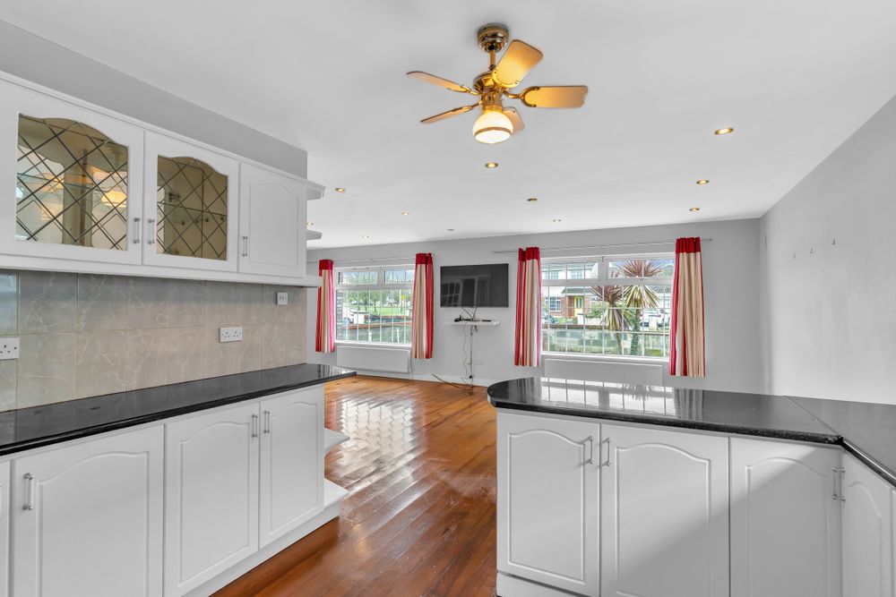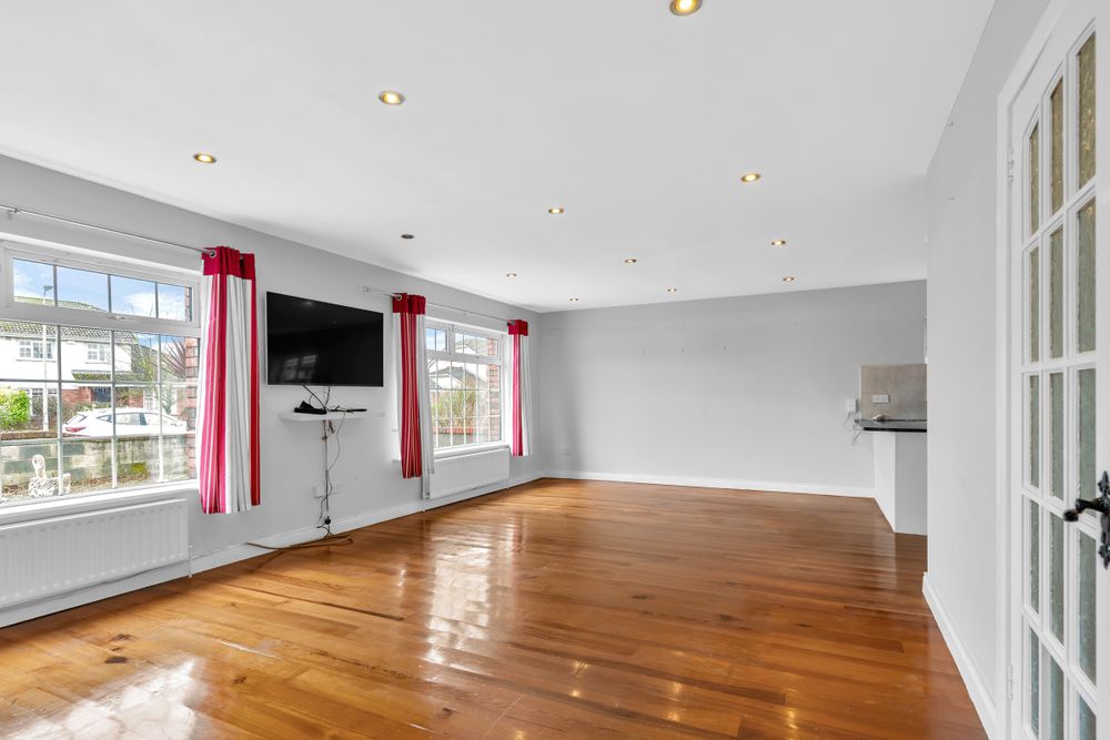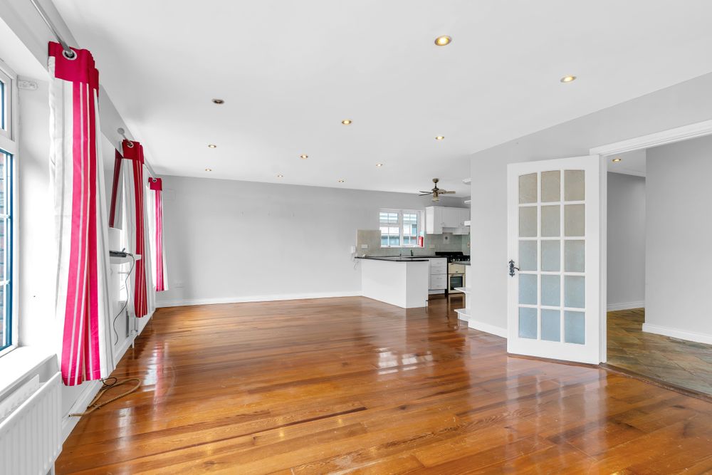 Spacious open plan area with two large windows overlooking front. Wood flooring. Recessed lighting to living/dining area.