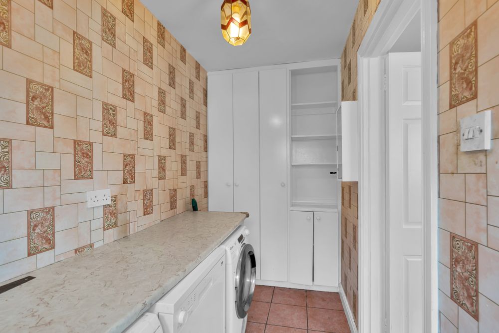 with tiled flooring, plumbed for appliances. Fitted storage press. Work counter. Exit door to side.