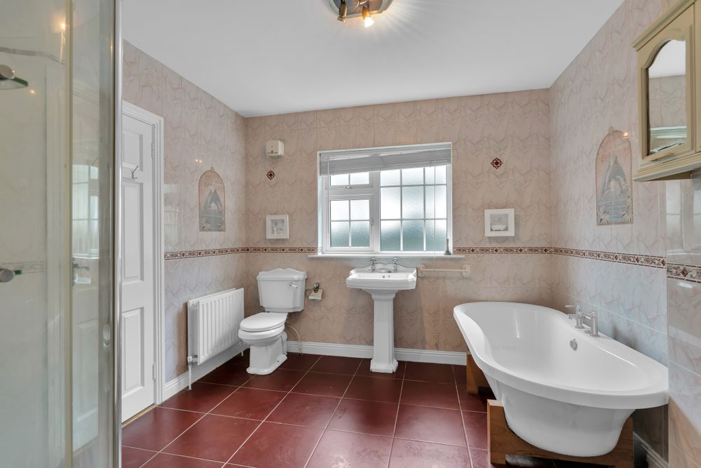Fully tiled with w.c., w.h.b., free standing bath and separate shower (Aquastream). Access from hall with door access also to Bedroom 1.