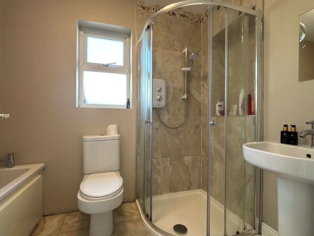 Tiled flooring and backsplash along with a W.C, W.H.B, Electric shower and bath.