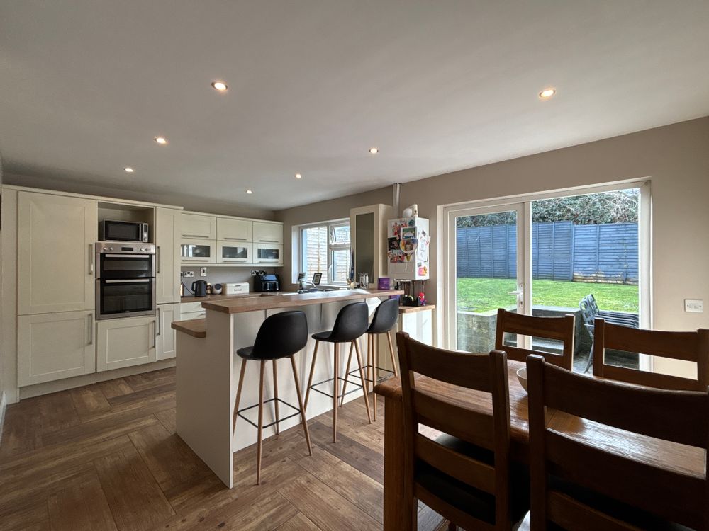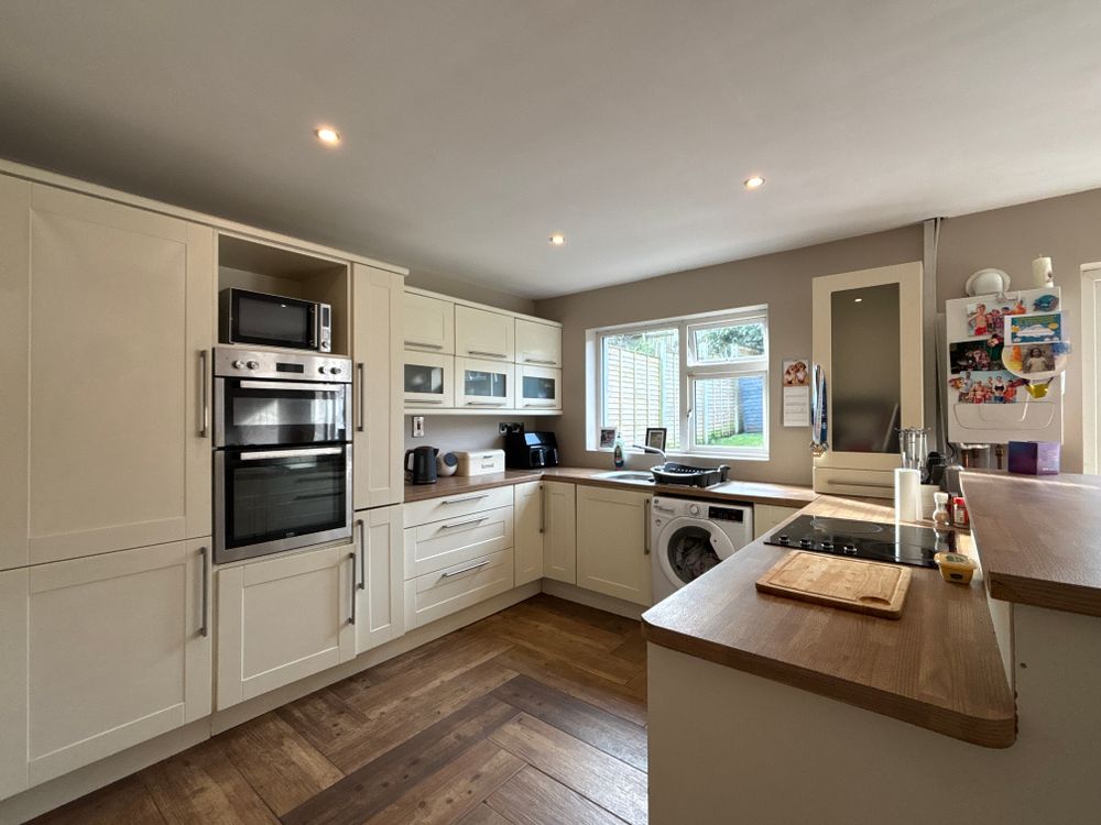 Timber flooring with units at eye and floor level along with plumbing for the sink and washing machine. You'll find ample light provided by the large windows and double doors overlooking the rear garden.