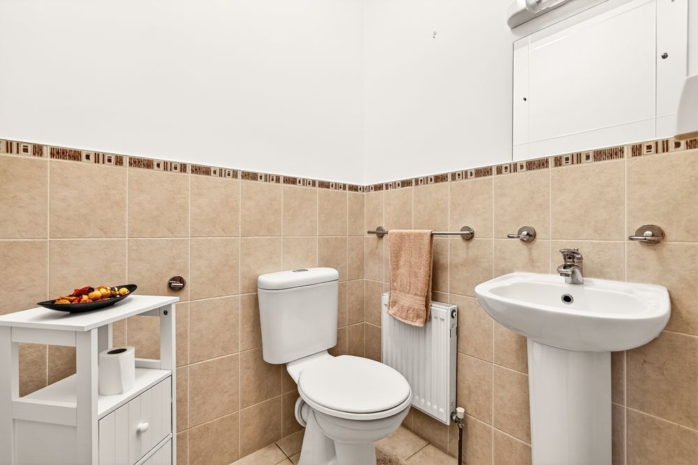 Finished with tiled flooring, fully tiled walls, includes toilet, wash hand basin and bath.