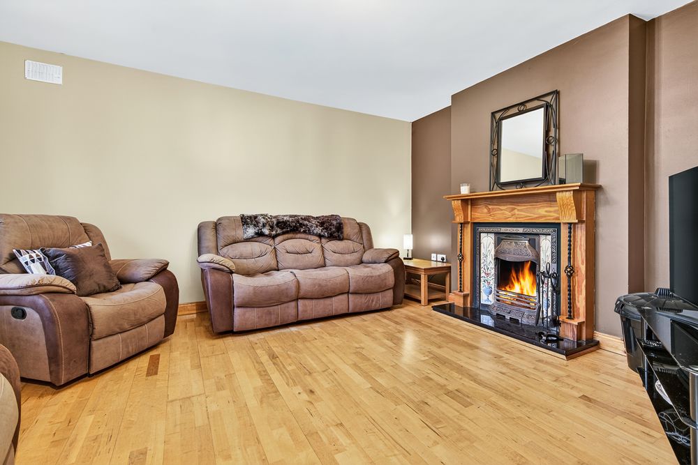 Finished with a laminate wood flooring and this room has an open fireplace and overlooks the front garden. The open fireplace is finished with a tiled and wood surround fireplace.