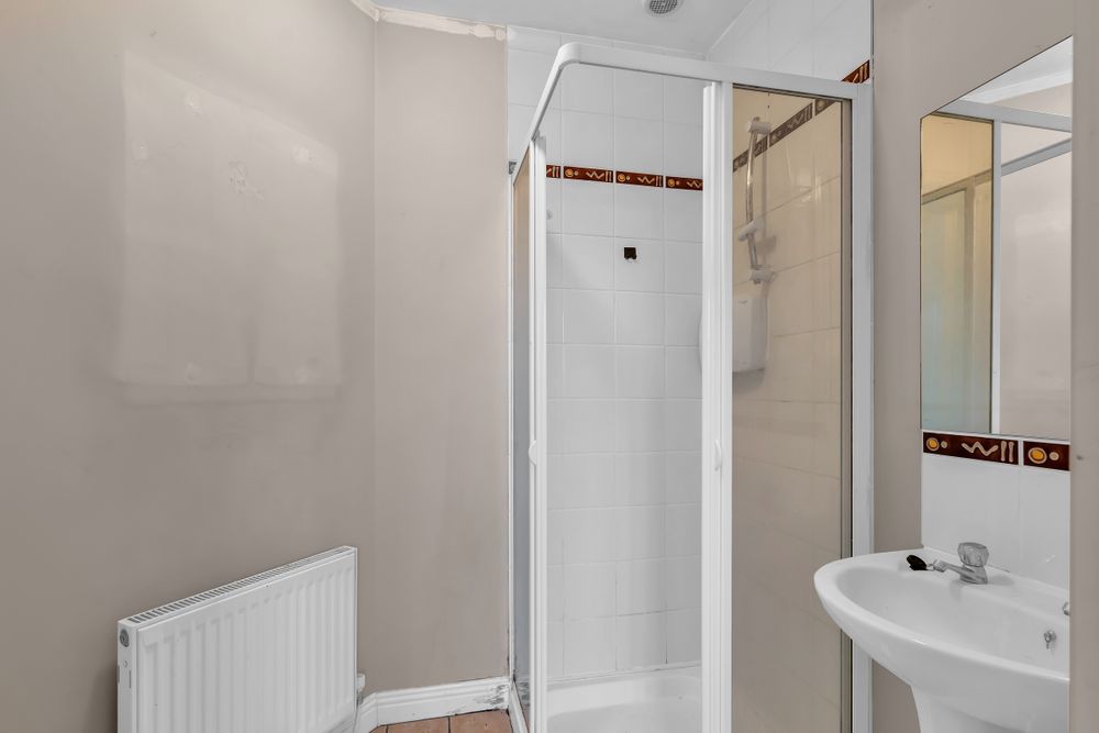 with w.c., w.h.b. & shower. Tiling to floor and to shower cubicle.