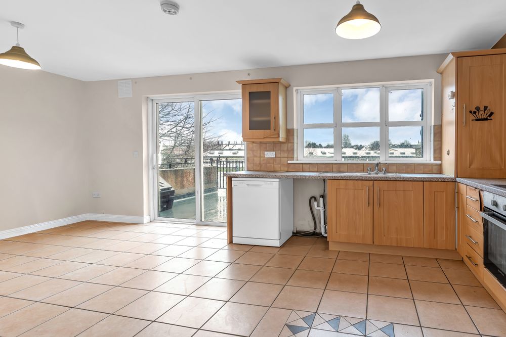 with shaker style fitted kitchen, electric hob & oven. French doors to large balcony area. Tiling to floor and around work counter.