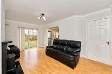 great dual aspect front living room with ceiling coving, laminate wood flooring, open fireplace, patio doors to the large westerly rear garden curtains/blinds included. Open plan to the kitchen/dining room