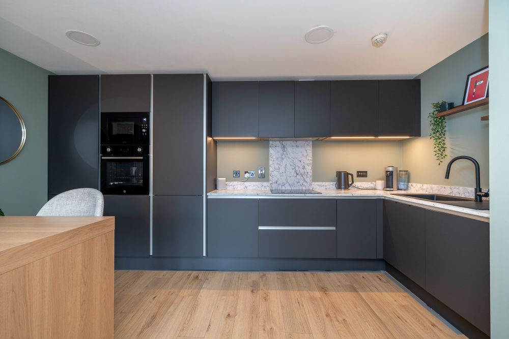 This impressive property opens into an entrance hall with laminate flooring, a storage room, and hot press. Off the hallway is a recently refurbished, fully tiled bathroom featuring a walk-in shower and under-sink storage. There are two bright, generously sized bedrooms, both with laminate flooring and built-in wardrobes. The accommodation is completed by a stylish open-plan living, dining, and kitchen area. The striking L-shaped kitchen is finished to a high standard, offering ample cupboard space and contemporary cabinetry. The living area is flooded with natural light from floor-to-ceiling windows and provides access to a spacious balcony—perfect for relaxing or entertaining. The apartment also benefits from a designated underground parking space.