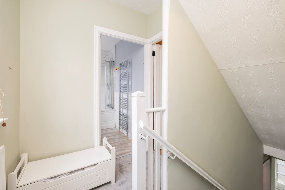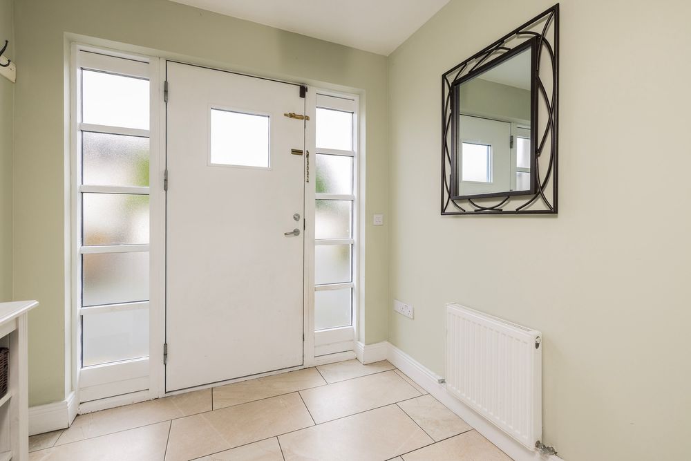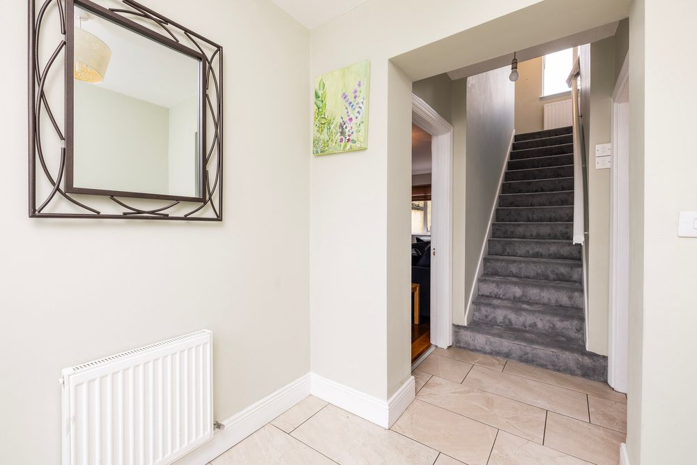 The hallway is bright, airy and inviting, at foot large cream ceramic tiles create a practical yet stylish statement and reflect the light beautifully. Carpeted staircase rises to the upper floor.