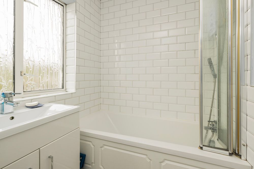 Luxurious bathroom with three piece in classic white, a built in vanity unit provides ample storage for all your bathroom needs and above the bath there is a Triton power shower unit with folding glazed screen, the room with is complete with tiled floor and extensive wall tiling in a brick wall effect in white is perfect for any colour scheme.