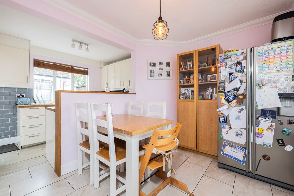 Again running from front to back of the property with dual aspect windows, this spacious kitchen diner boasts plenty of room for designated cooking and dining areas. With direct access to the rear garden its perfect for family living and entertaining. The kitchen area features an excellent range of Shaker style wall and floor units in contemporary cream topped with butchers block countertops and featuring a classic brick wall effect tiled splash back in contemporary grey. Large cream porcelain tiled flow seamlessly throughout the room. Dining area with plenty of room for a large dining table.