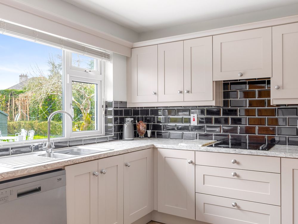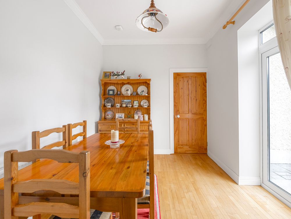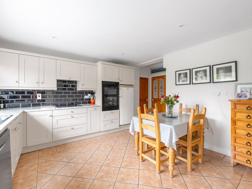 The hallway leads through to a fresh and light-filled kitchen/dining area. The kitchen is fully fitted with ample storage presses and generous worktop space, complemented by tiled flooring for a clean and contemporary finish. Just off the kitchen is a practical utility room with direct access to the rear garden, along with a ground-floor bathroom, adding further convenience to everyday living.