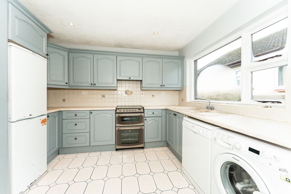 Fitted kitchen units, tiled flooring and splashback, access to side