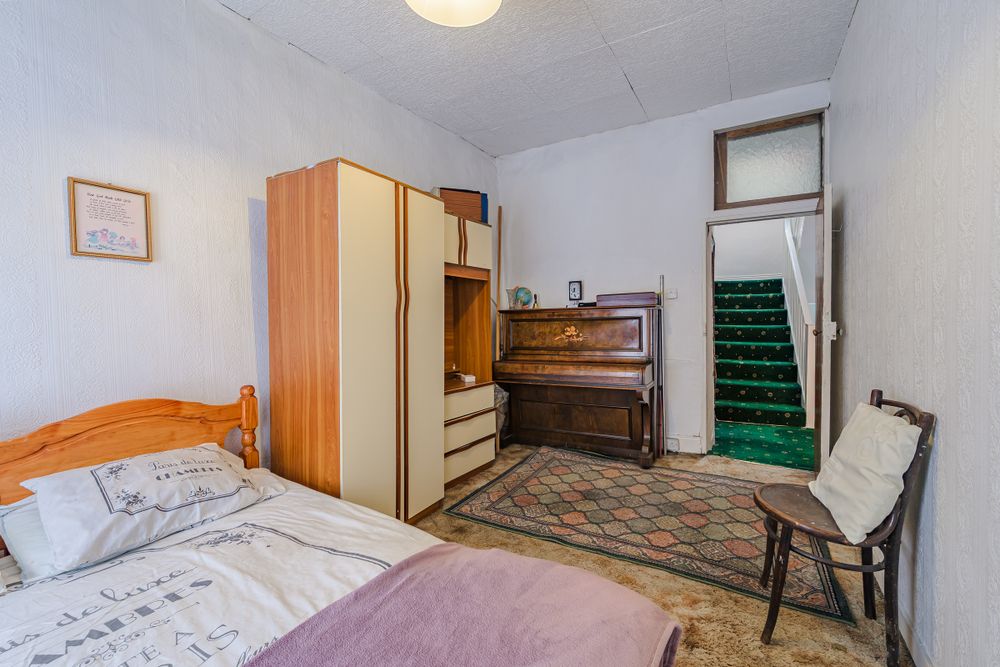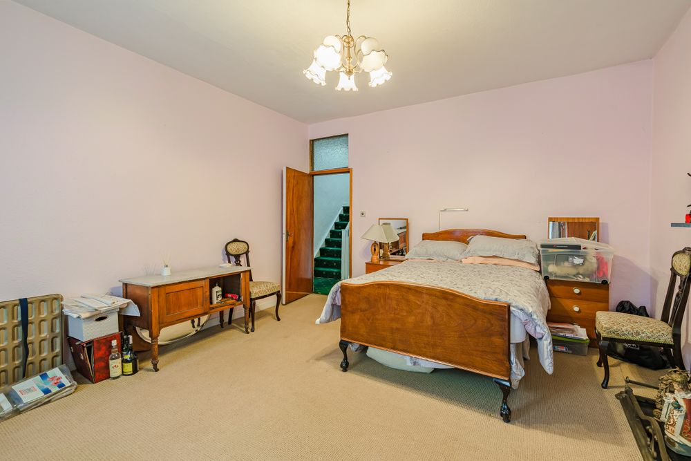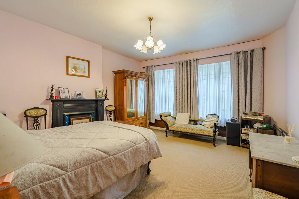 An impressive bedroom located to the front of the home and once acted as the main living room when downstairs was a shop. This room has a black fireplace with attractive tiled inset and black cast iron inset. Two impressive windows with shutters that could be easily brought back into action make this room exceptionally bright. Finished with carpet.