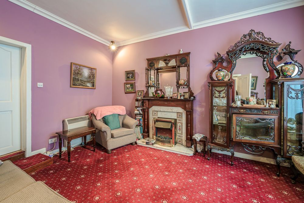 Located off the entrance hall is a really impressive lounge once home to the shop that traded from here in times past. The lounge still enjoys a double fronted extensive window running the entire width of the front of the room with original cast iron upstand in its centre. The window is deep set with glazed returns. A marble fireplace sits at its heart with marble plinth and inset tiles with mahogany surround. This room with 9ft floor to ceiling height is painted in appealing warm tones and is finished with carpet and cornicing.