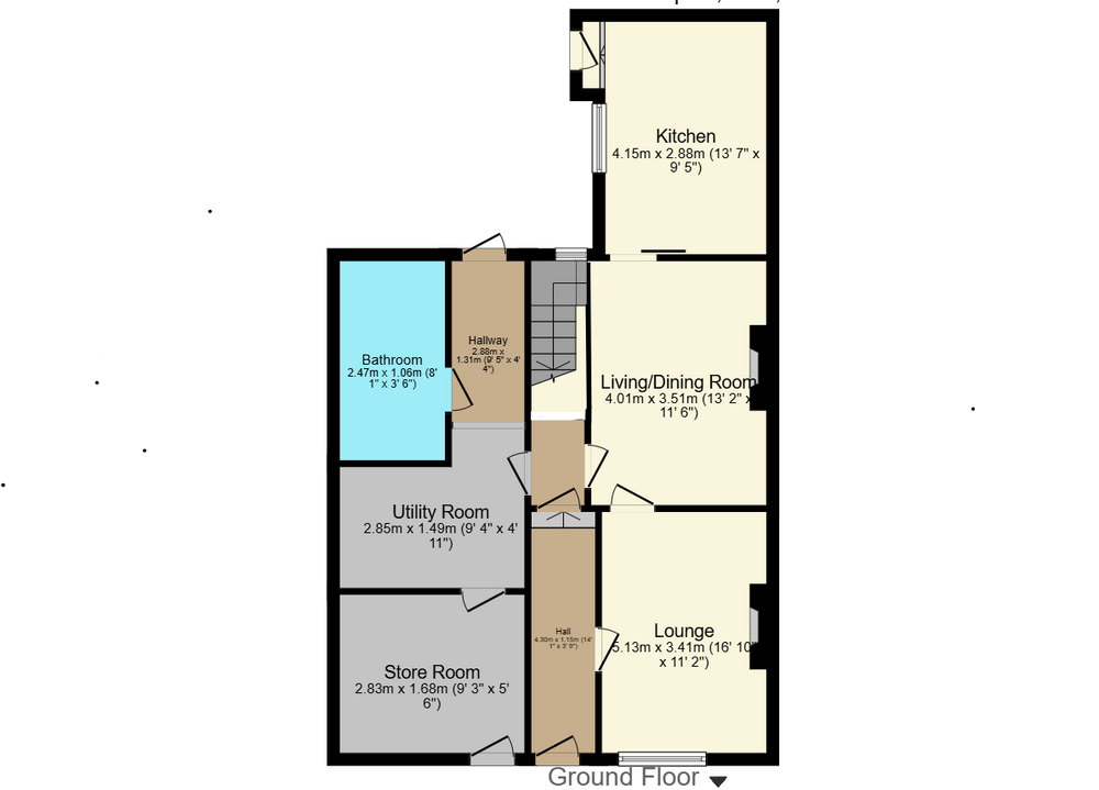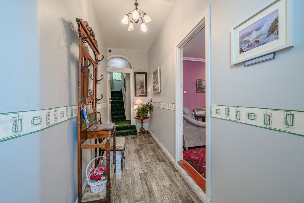 Bright and welcoming with original front door painted black. The floor to ceiling heigh of 9ft 7” is impressive. The entrance hall leads through an original inner door complete with fan light overhead to the rest of the home.