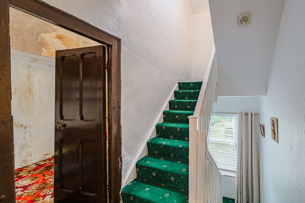 A carpeted staircase leads to the upper floors of this home passing a gable window as well as Velux at the half landings flooding the entire staircase with lots of natural light.