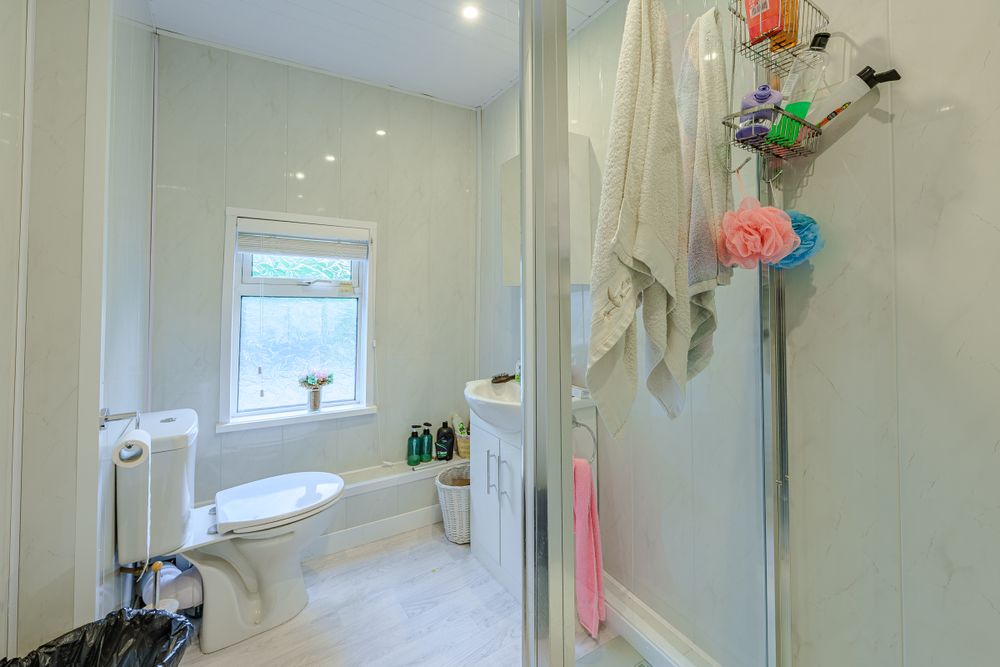 Fitted with three piece white suite to include pedestal sink with mirrored vanity press overhead. Shower cubicle with electric shower fitted. A WC completes the suite. The room is fully panelled and has fitted heated towel rail.