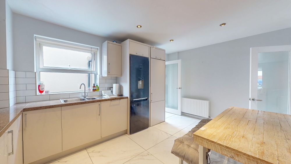 Lovely open plan family kitchen diner with plenty of space for both cooking and dining. The kitchen is well equipped with a super range of contemporary cream high gloss wall and floor units incorporating a built-in oven and microwave, a ceramic hob with extractor fan overhead, integrated dishwasher, double stainless steel sink and drainer finished with attractive brick wall effect tiles, the entire is floored in large porcelain marble effect floor tiles making the room feel even larger.