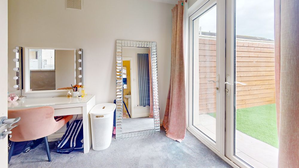 Luxurious primary suite, the bedroom area has an arch leading to a dressing room area with French doors leading to the garden. The ensuite shower room features extensive tiling adding a touch of hotel luxury with wc, wash hand basin and shower cubicle home to a Triton electric shower unit.