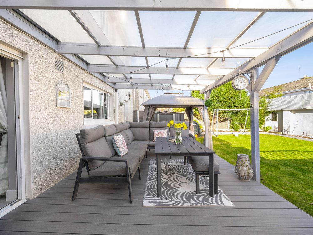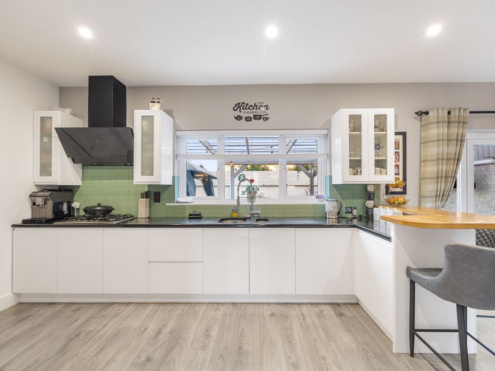 The kitchen/dining area is a true highlight, featuring upgraded kitchen units, black granite worktops, ample workspace, and a breakfast bar. Bi-folding rear doors open directly onto a superb outdoor living space: 22 sqm of composite decking, fully covered by a pergola, perfect for year round enjoyment. The kitchen is further complemented by a utility room with side access and a convenient downstairs W.C.