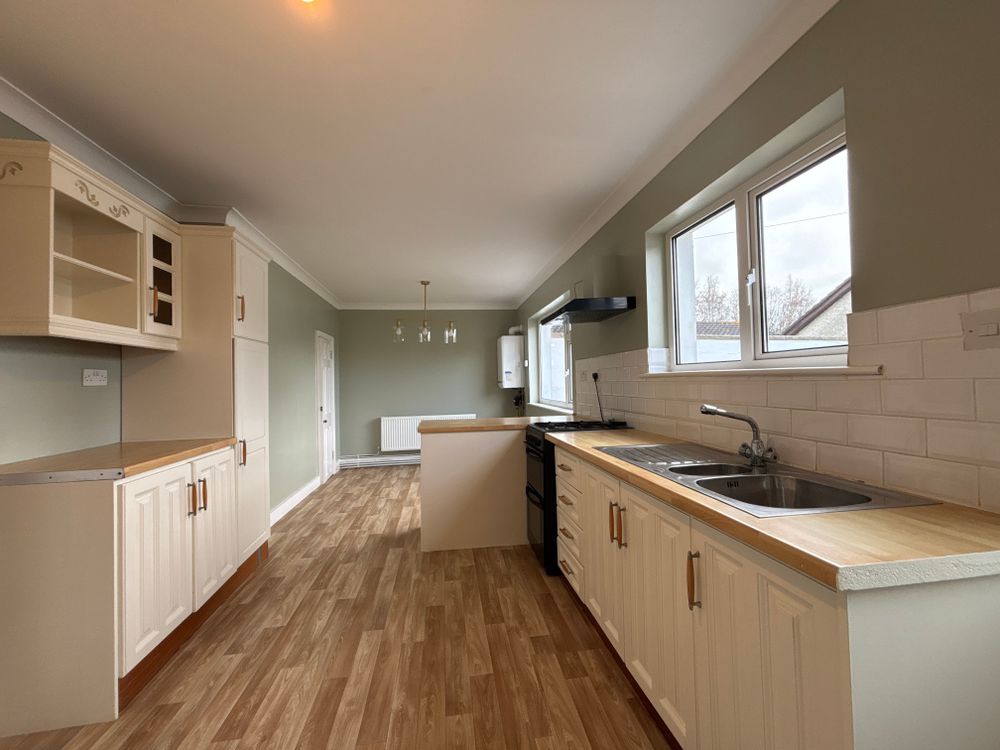 Laminate flooring with a tiled backsplash and units at eye and floor level. Door to rear and windows overlooking the rear garden