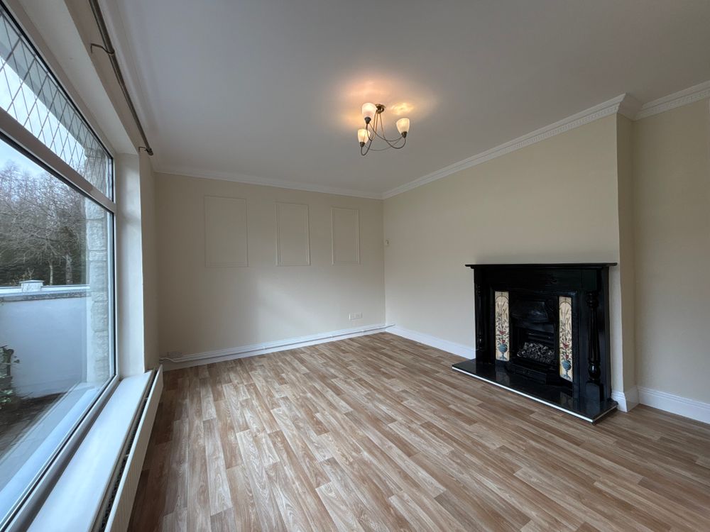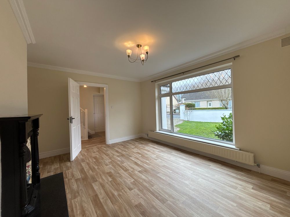 Laminate flooring large window overlooking the front garden.
