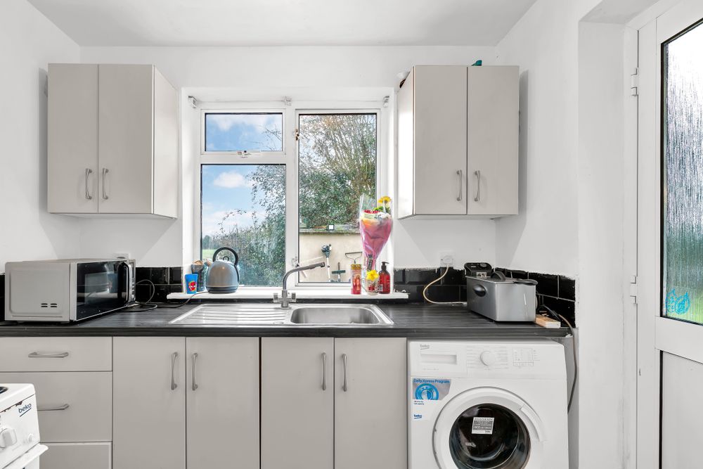 with fitted storage presses and sink unit. Plumbed for washing machine, tiled floor.