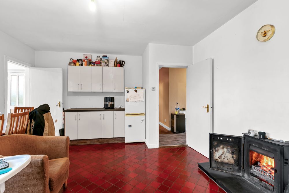 with fitted low and eye level units, tiled floor. Solid fuel stove.