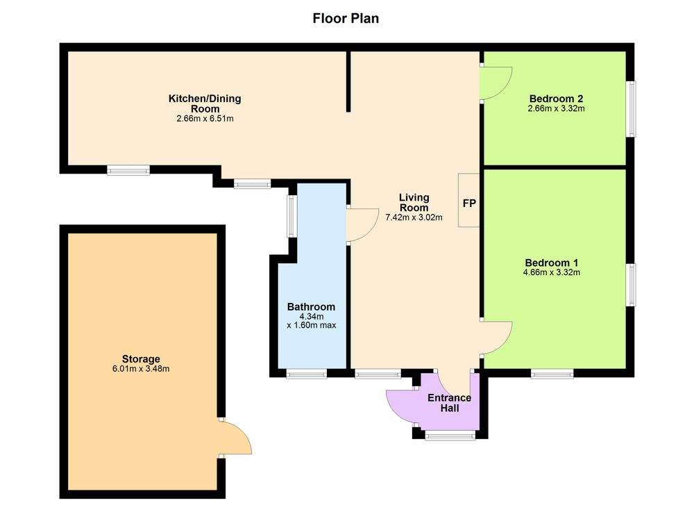 The current accommodation comprises an open-plan living and dining room with stove, two bedrooms, a kitchen, and a family bathroom.