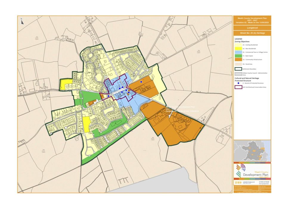 The town is serviced by the Longwood Water Treatment Plant and there is considered to be spare capacity to facilitate the development growth provided for in the current County Development Plan. The Longwood Wastewater Treatment Plan is currently being upgraded and will create additional capacity.