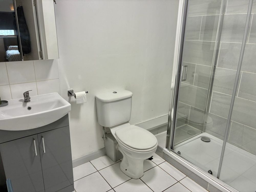 Tiled floor and surround of generous walk in shower. Triton T80 electric shower