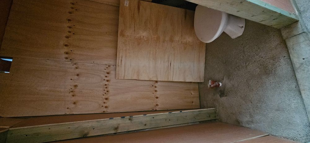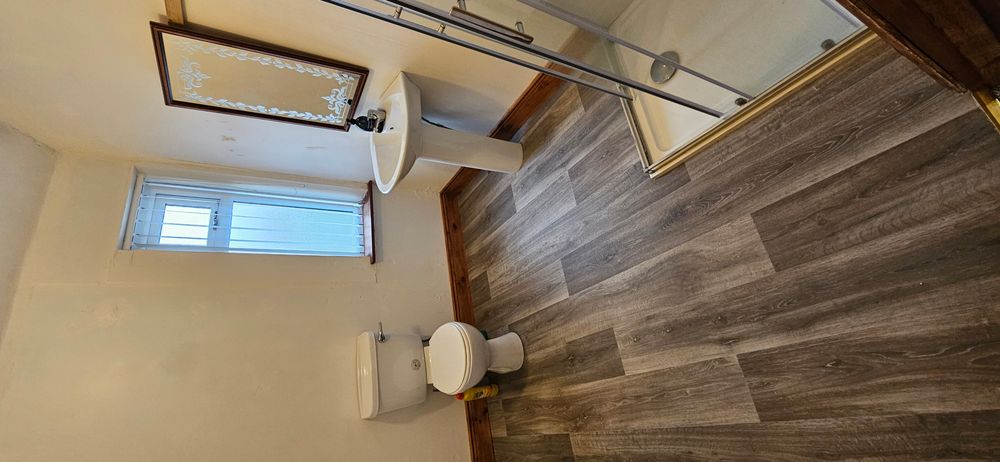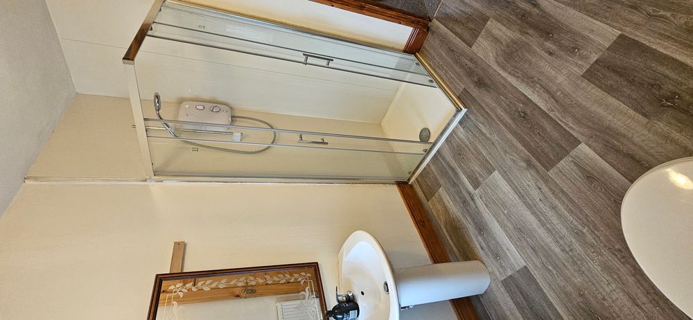 Wood effect vinyl flooring, radiator, wc, whb, shower cubicle with electric shower unit.