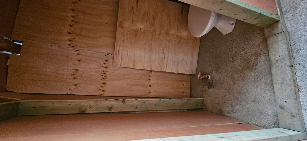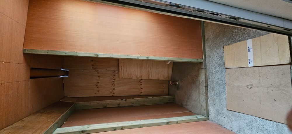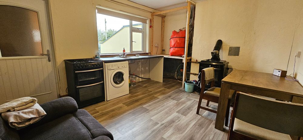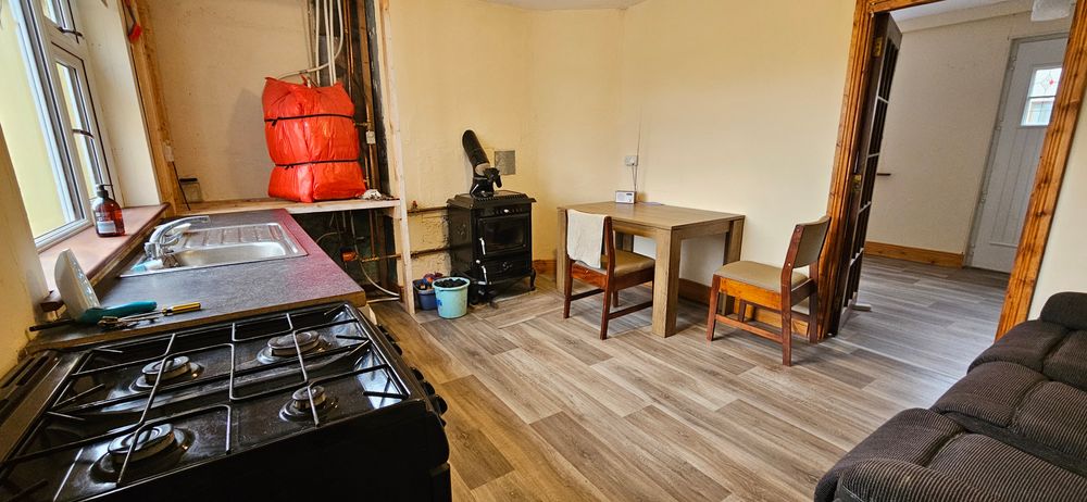 Wood effect vinyl flooring, large landscape pvc window overlooking rear garden, sink unit, solid fuel stove, hot water tank and immersion, washing machine, gas cooker, power points.