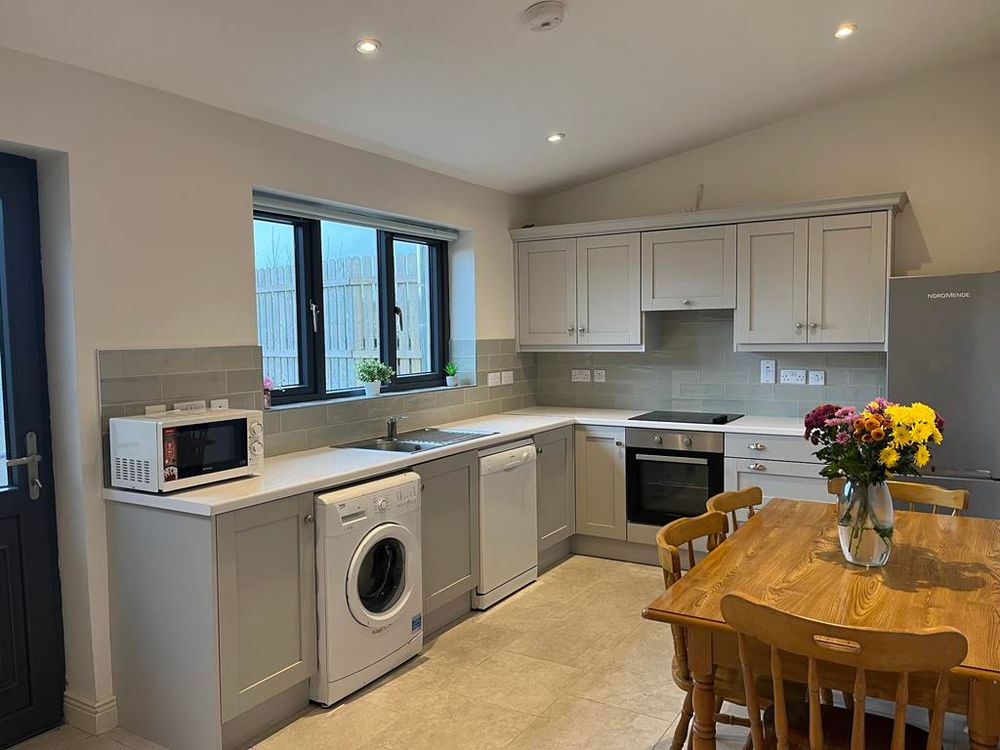 Floor & Eye level units, tiled floor and splashback, built in oven &,hob, extractor, plumbed for washing machine & dishwasher, door to rear yard