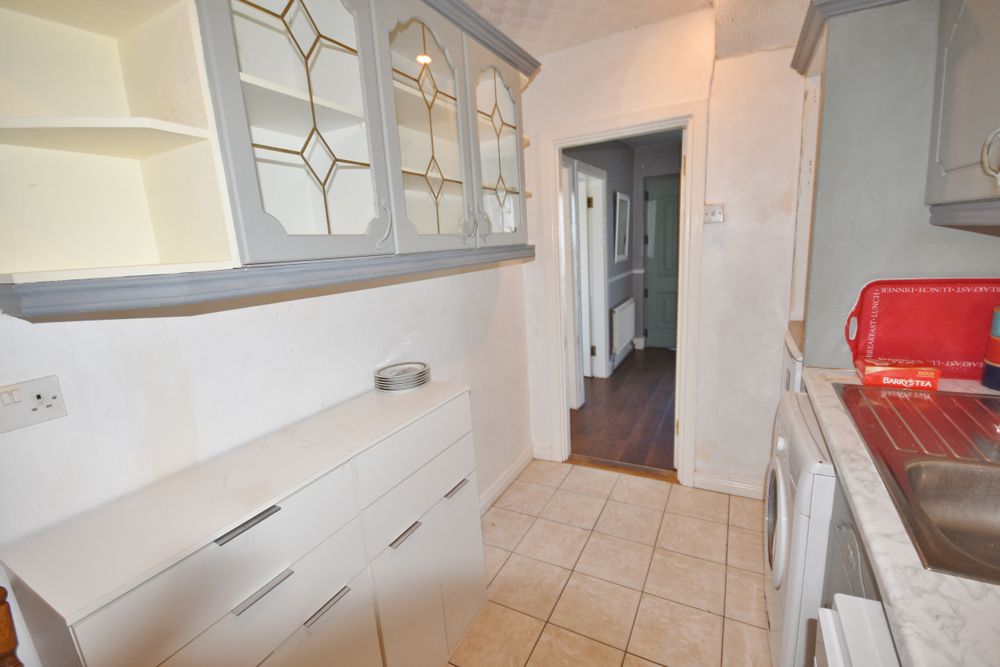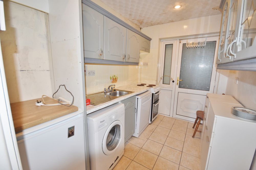 Tiled flooring. Fitted units. Electric cooker. Sink. Washing machine. Dishwasher.