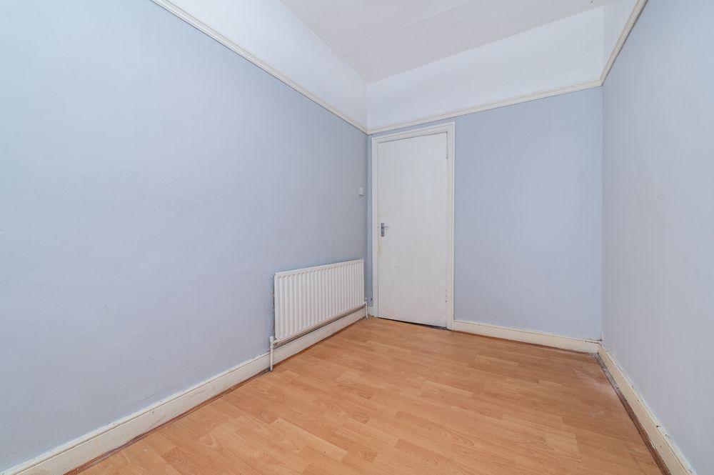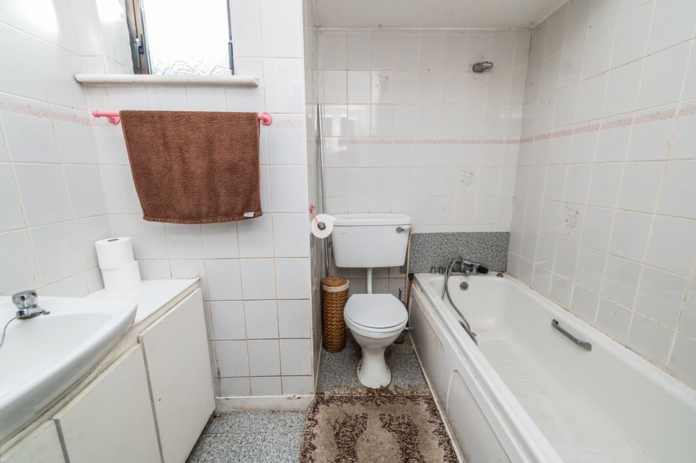 w.c., vanity w.h.b., tiled wall, bath with shower attachment, fitted press, coving