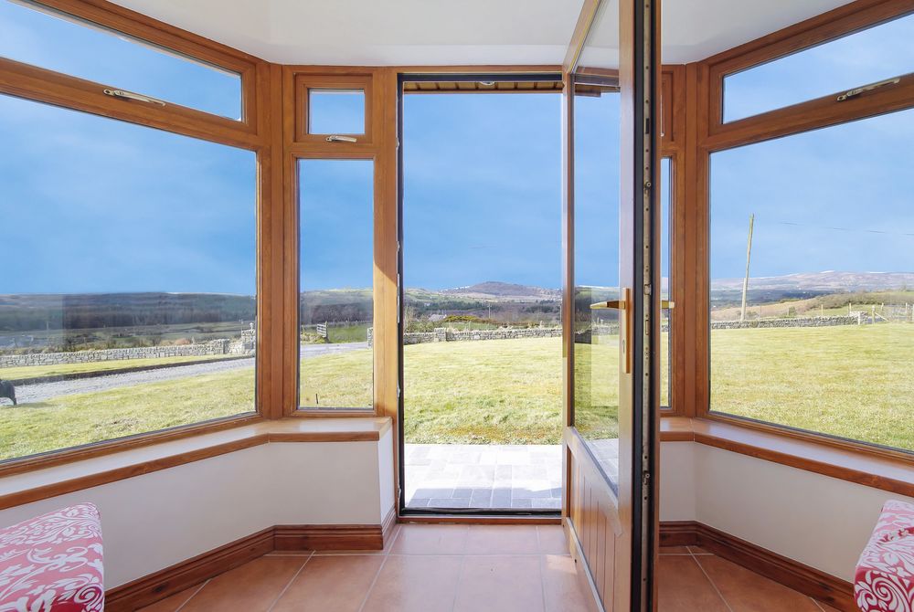 Tiled floor, windows offering countryside views